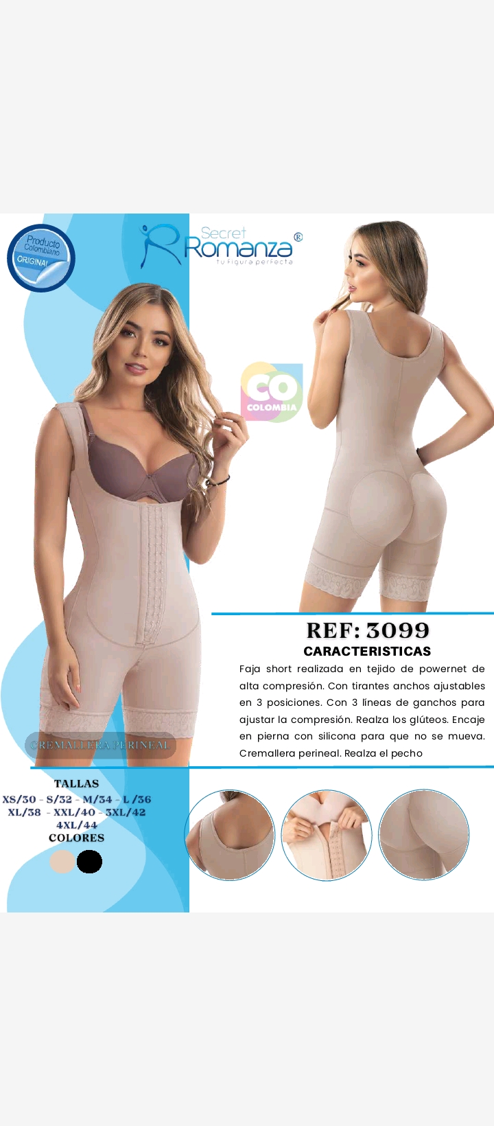 Faja short realizada en tejido de powernet de alta compresión. Con tirantes anchos ajustables en 3 posiciones. Con 3 líneas de ganchos para ajustar la compresión. Realza los glúteos. Encaje en pierna con silicona para que no se mueva. Cremallera perineal. Realza el pecho