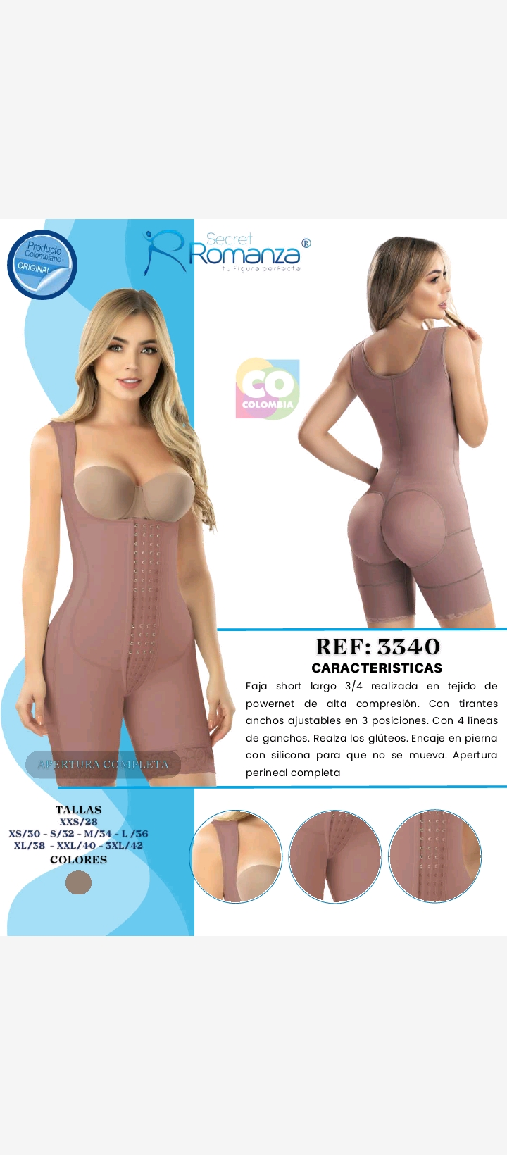 Faja short largo 3/4 realizada en tejido de powernet de alta compresión. Con tirantes anchos ajustables en 3 posiciones. Con 4 líneas de ganchos. Realza los glúteos. Encaje en pierna con silicona para que no se mueva. Apertura perineal completa.