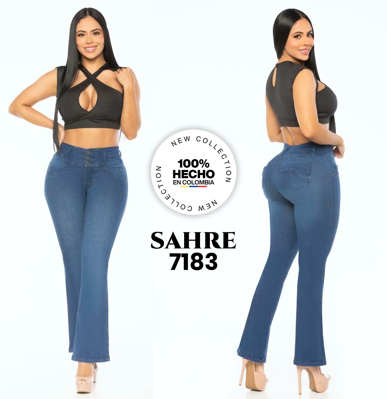 El jean colombiano Ref. 7183 de Sahre ha sido diseñado para realzar tus curvas con un ajuste perfecto y un estilo moderno. Su corte tipo bootcut estiliza la figura desde la cintura hasta el tobillo, mientras que su sistema push up levanta y moldea el glúteo de forma natural.