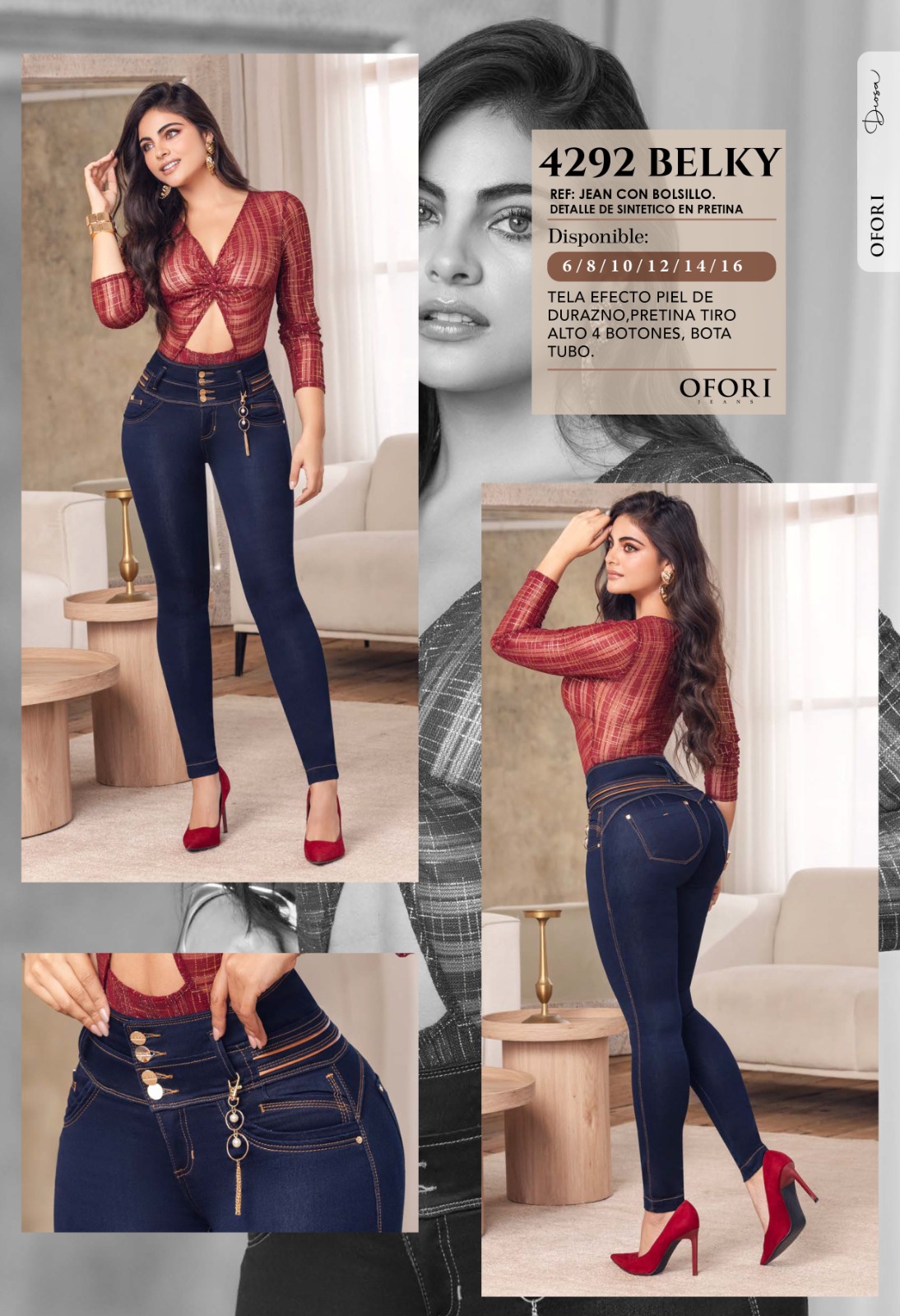 El Jean Belky Ref. 4292 de Ofori está diseñado para realzar tu figura con un ajuste perfecto y un toque de sofisticación. Su pretina alta con cuatro botones define la cintura y ofrece una sujeción ideal, mientras que el detalle sintético en la pretina añade un acabado moderno y elegante.